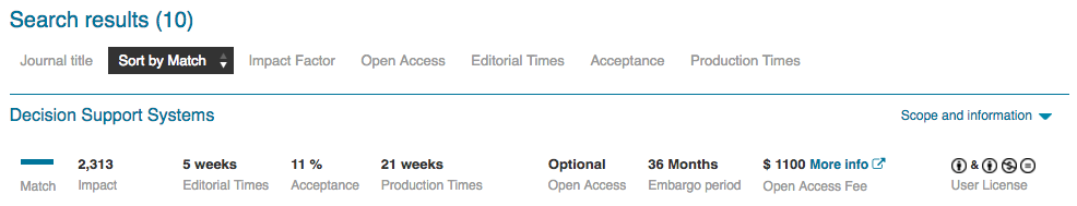 역시 제일 위의 결과로 뜨는군요. 참고로 엘제비어는 유럽 네덜란드 회사기 때문에 소수점 표기를 점으로 하지 않고 쉼표로 합니다. DSS의 임팩트 팩터는 2.313이군요. Acceptance rate은 11%… 오 생각보다 낮은데. Editorial Weeks가 짧을수록 에디터가 일을 좀 재깍재깍 처리한다는건데, 5주면 상당히 빠른거네요. DSS가 진짜 빠르긴 해요. 사실 연구하다보면 저널 어디에 낼지 대강 아니까 이런거 굳이 찾아볼 일이 별로 없기는 한데, 저도 탑저널들 acceptance rate이 궁금할 때나 한번씩 찾아봅니다. 그리고 엘제비어에서 이 Journal Finder라는 서비스에 별로 신경을 안 쓰는지 가끔식 홈페이지가 다운되어 있더라고요. 아무튼 도움되셨길~