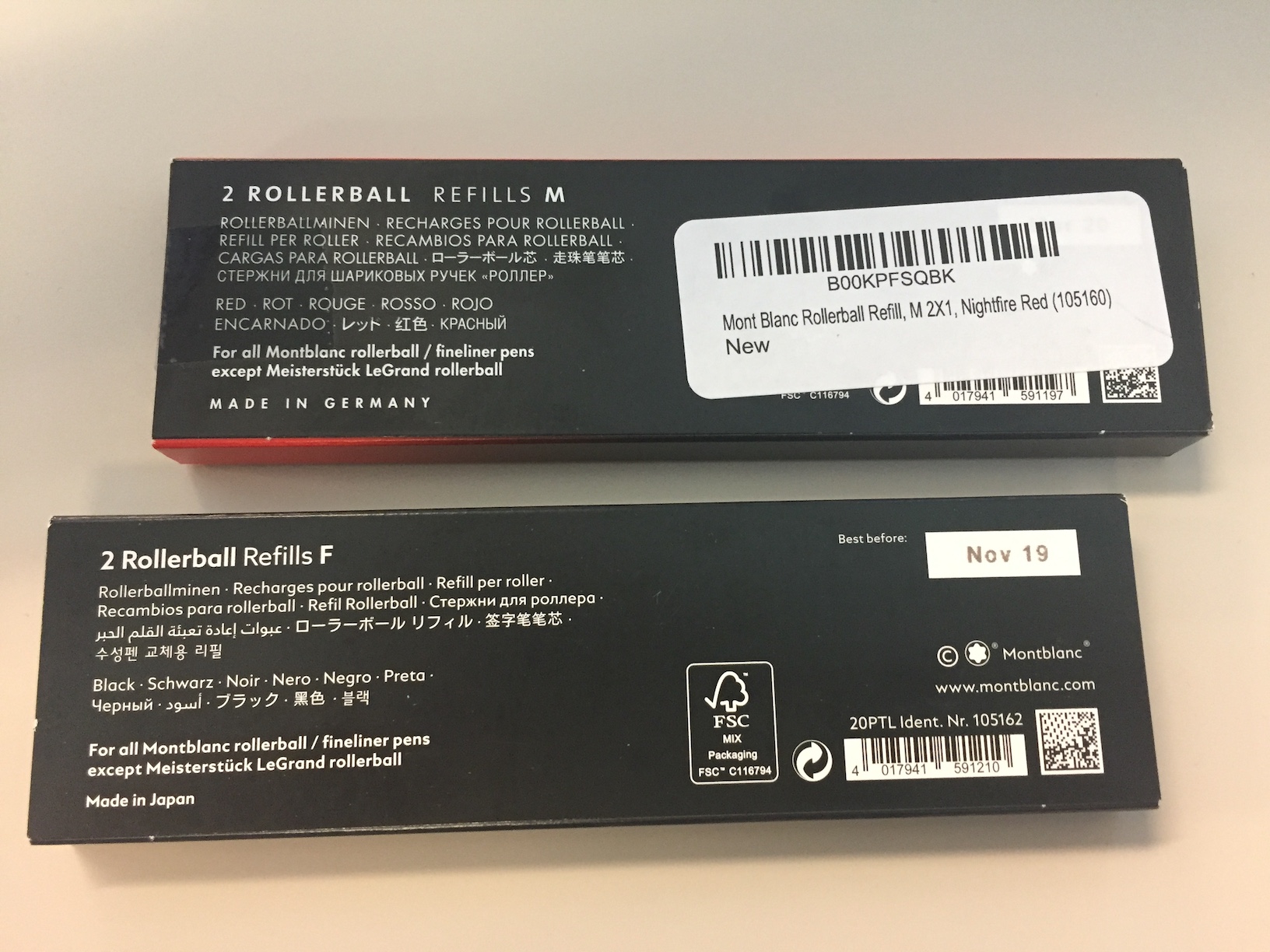 참고로 ballpoint pen은 우리가 흔히 말하는 볼펜이니까 혼동하지 않도록 주의하자. 위에 박스를 보니까 리필이 최소한 두군데서 생산되는 것을 볼 수 있다. 검은펜심은 일본에서 생산되었고, 빨간펜심은 독일에서 생산됐다. 나중에 써보니까 독일 펜심이 좀 더 오래가는 것 같았다. 그리고 펜 굵기는 검은펜은 F (fine; 가늚), 빨간펜은 M (medium; 중간)으로 샀다.